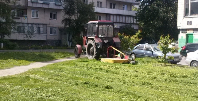 На балансовій території «ЖЕД -5» працівниками КПУБ та наданою механізованою технікою КП «Керуюча компанія з обслуговування житлового фонду Святошинського району м. Києва» здійснюються роботи по упорядкуванню прибудинкових територій, а саме покосу трави.