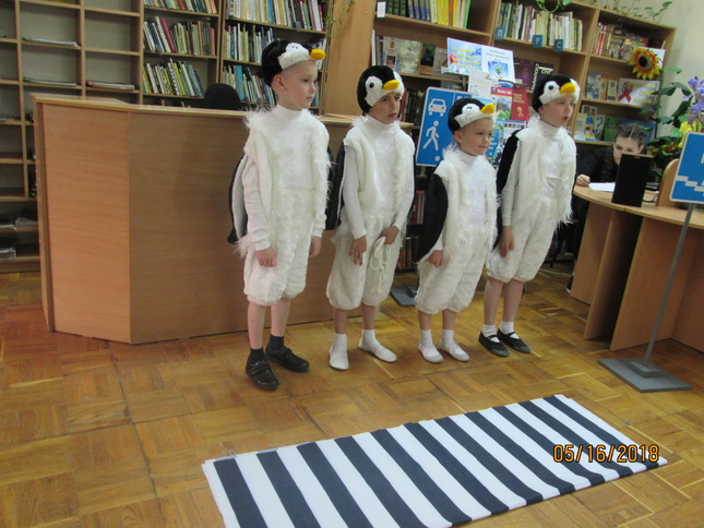 До бібліотеки на зустріч з учнями 1-х класів загальноосвітньої школи №131 завітали герої з мультиплікаційного фільму «Мадагаскар». Чудернацькі пінгвіни на чолі зі Шкіпером, зебра Марті, лемури Морт, Моріс та їх король Джуліан, бегемотиха Глорія, жираф Мелман, лев Алекс та інші звірі, - розповіли дітям про правила дорожнього руху та показали цікаву виставу.
