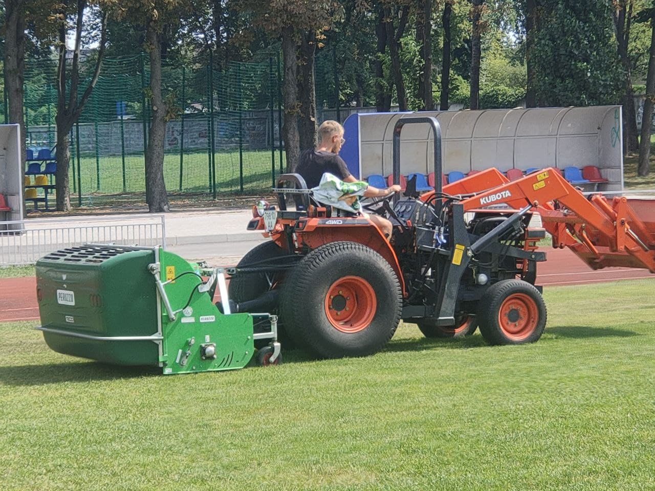 На фото можна побачити, яка техніка застосовується для прибирання опалого листя на штучних футбольних майданчиках та скарифікації трав'яного газону.