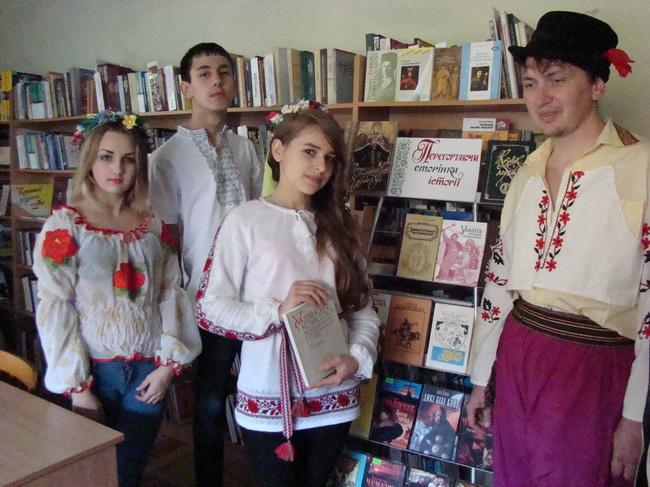 Про різновиди українських хусток, про їх колір та орнамент розповіла присутнім завідувач бібліотеки Людмила Григорівна Ричек, - «Про коштовність хусток свідчить той факт, що за польської влади на Західній Україні чоловік повинен був десять днів працювати аби купити своїй дружині хустку», - та представила до перегляду цілу колекцію різнобарвних хусток, якими покривали голови українські жінки у різні періоди свого життя, адже у народно-обрядовому календарі до Покрови завершувався період сватань і приготувань до весіль. Дівчата, котрі бажали взяти шлюб саме цього дня мали побувати у церкві і помолитися: «Свята Покрівонько, покрий мені голівоньку», «Свята мати, Покровонько накрий мою головоньку, хоч ганчіркою, аби не зостатися дівкою».