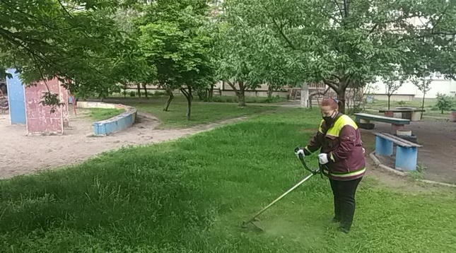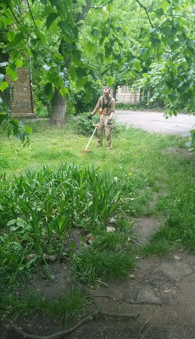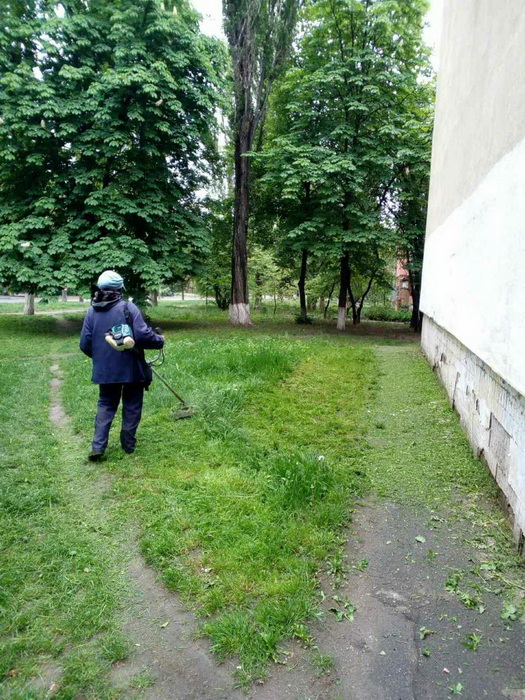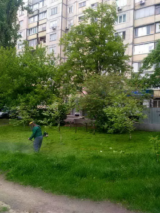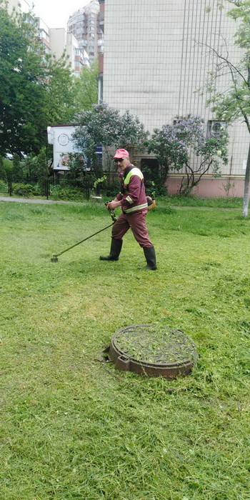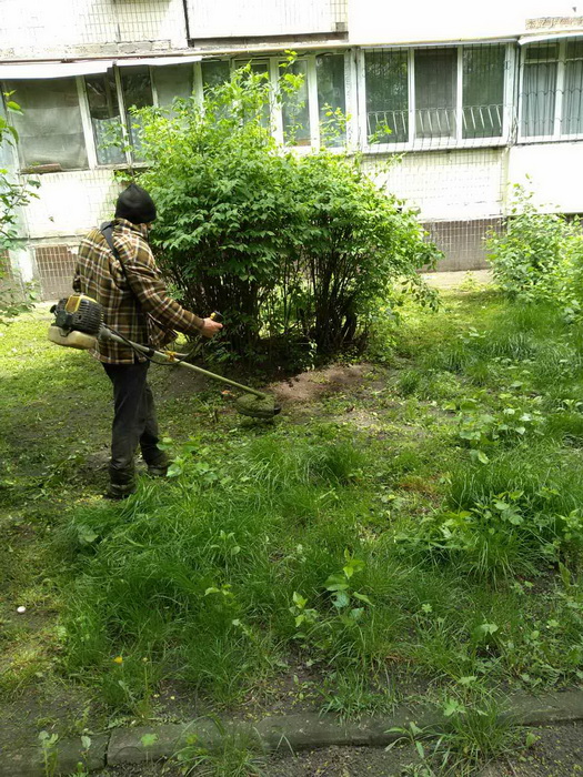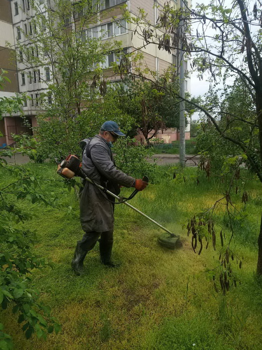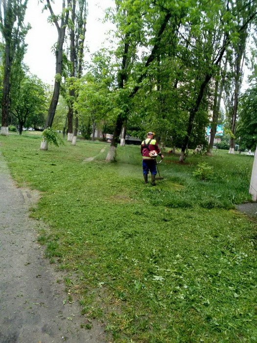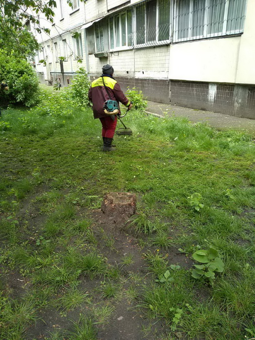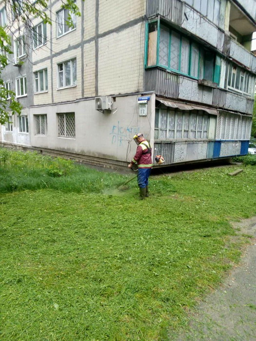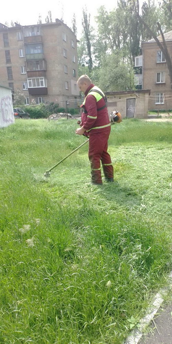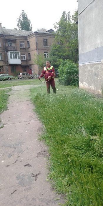 Робітники житлово-експлуатаційних дільниць Святошинського району проводять покіс трави на прибудинкових територіях (фото)