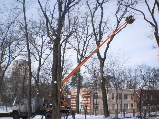 Так, у сквері між вулицями Краснова та Семашка видалено 4 сухостійних аварійні дерева, а по бульвару Вернадського виконано очищення 18 дерев від омели.