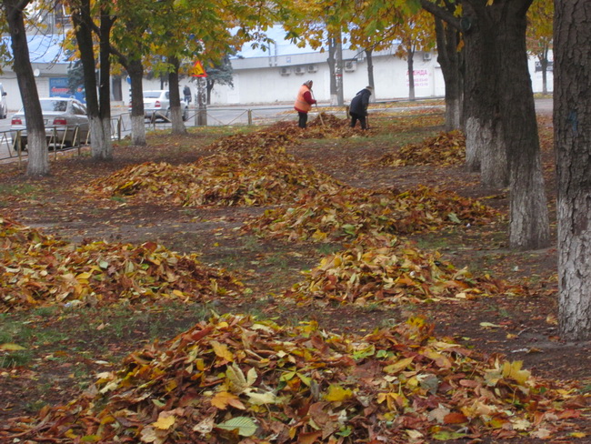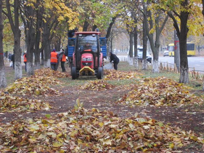Дощова погода минула, настали погожі осінні дні і працівники комунального підприємства «По утриманню зелених насаджень Святошинського району» продовжили роботи по очищенню балансових територій від опалого листя.