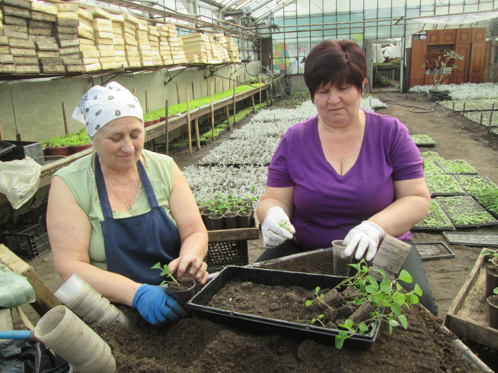 На тепличній дільниці КП УЗН Святошинського району щоденно кипить робота з вирощування квіткової розсади для озеленення району. Наразі проводиться посадка із касет у горщики бегонії вічноквітучої та шавлії блискучої.