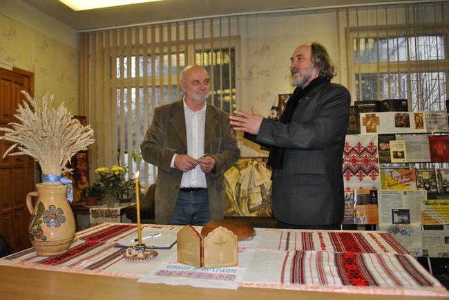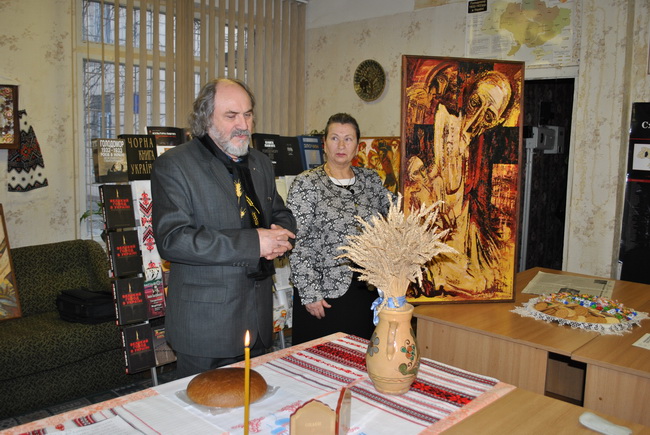 До уваги присутніх Валерій Олександрович представив декілька своїх картин із циклу «Розгойдані дзвони пам'яті». Ці твори – спроба відомого художника передати трагічні сторінки голоду мовою мистецтва. Митець поділився з присутніми спогадами своєї матері про страшний голод, який вбив мільйони українців; розповів про свою творчість, яку присвятив історії козацької доби, пам’яті жертв голодомору і тяжкій праці ліквідаторів аварії на Чорнобильській АЕС. Крім того у приміщенні бібліотеки розгорнуто масштабну виставку інформаційних плакатів «Схилімо голову» та книжкову виставку «Великий голод в Україні» на якій представлені твори українських письменників, присвячених темі Голодомору.