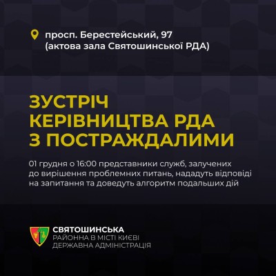 Запрошуємо вас на збори з головою Святошинської РДА Георгієм Зантараєю та представниками служб, залучених до розв’язання проблемних питань, що виникли через російську атаку.