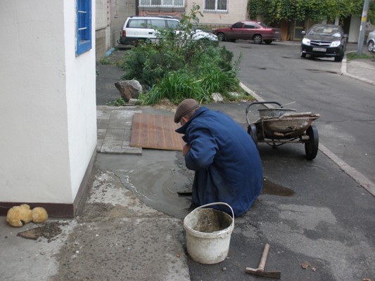 Щорічні відновлення бетонного покриття перед під’їздом виявилися неефективними, тому було прийнято рішення вимостити перед входом в під’їзд площадку з бетонних плит.