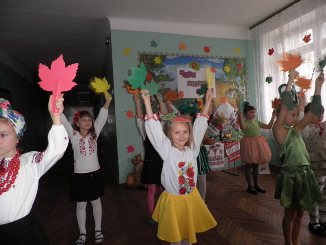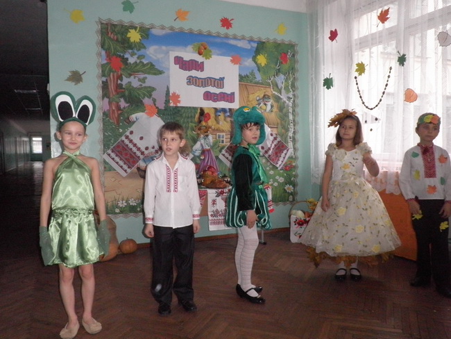 Присутні мали можливість побачити в залі дарунки щедрої осені: букети осінніх квітів, вироби учнів з гілок, шишок, каштанів, природного матеріалу, почути пісні, вірші про золоту осінь, переглянути виставу "Ходить гарбуз по городу", закружляти в таночку з "осінніми листочками".