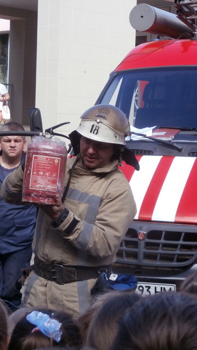 Закінчивши ліквідацію займання, рятувальники показали учням техніку, обладнання та спорядження, за допомогою яких проводиться ліквідація надзвичайних ситуацій. Діти мали можливість сфотографуватись біля пожежного автомобіля та за бажанням приміряти бойовий одяг вогнеборців.
