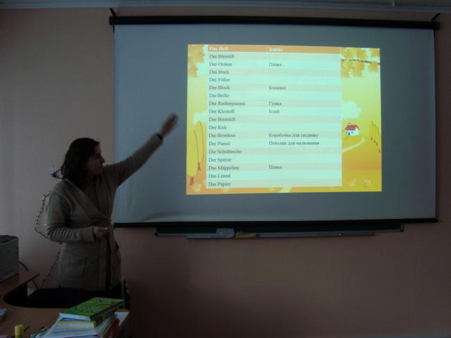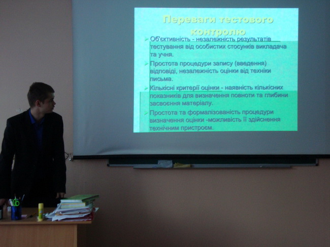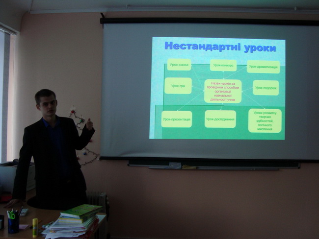 Молоді вчителі заздалегідь підготували теоретичний і практичний матеріал про типи сучасного уроку, зокрема комбінований урок з німецької мови продемонструвала вчитель англійської та німецької мов Фіголь О.В., урок засвоєння нових знань з німецької мови підготувала та показала Шпонарська Ю.О., Кузнєцова В.О. запропонувала урок засвоєння нових знань з англійської мови, урок контролю і корекції знань і вмінь продемонстрував вчитель математики Куницький В.П., вчитель історії Галета І.В. розповів про урок практичного застосування знань, навичок і умінь.