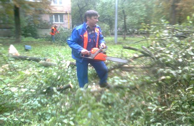 Під час проведення робіт з розпилювання повалених дерев на прибудинкових територіях по вул. Доброхотова, б.12, б.10, б. 8, б.7, проспекті Академіка Палладіна, 24, бульварі Академіка Вернадського, б.83, б.85, б.87 до відновлювальних робіт долучилися працівники технічних дільниць № 1 та №2 Табур Л.І., Гутник Н.М., Буряк В.І.