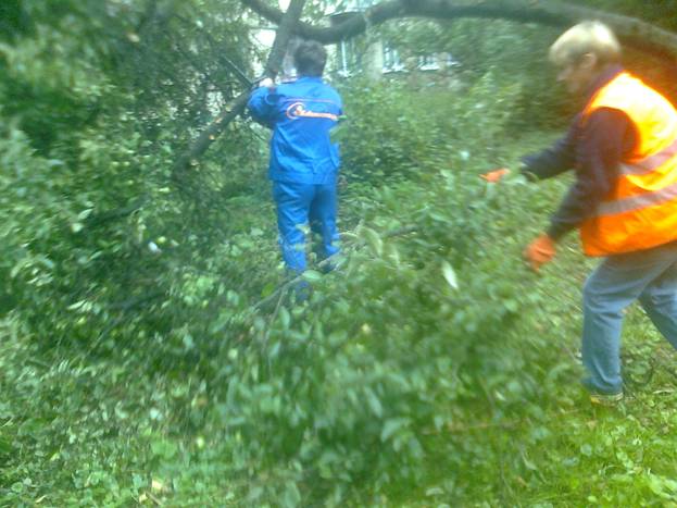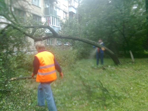 З метою швидкого реагування, працівниками з утримання житлових будинків та прибудинкових територій небезпечні місця було негайно огороджено обмежувальними стрічками, а вже з самого ранку 25 вересня двірником підприємства Бабським Борисом Івановичем було виконано значний обсяг робіт по усуненню наслідків несприятливих погодних явищ.