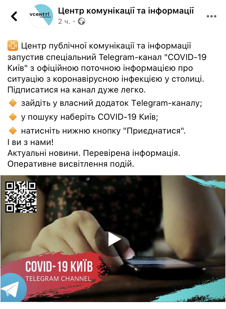 Центр публічної комунікації та інформації запустив спеціальний Telegram-канал "COVID-19 Київ"