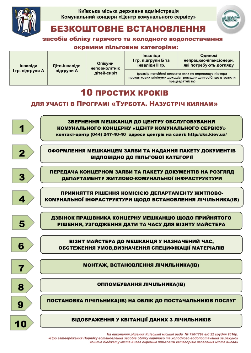 Центр комунального сервісу спільно з Департаментом соціальної політики КМДА розпочали встановлення квартирних лічильників для пільгових категорій населення. Встановлення водомірів здійснюється згідно з міською соціальною програмою «Турбота. Назустріч киянам» на 2016-2018 роки». Про це повідомив заступник голови КМДА Петро Пантелеєв.