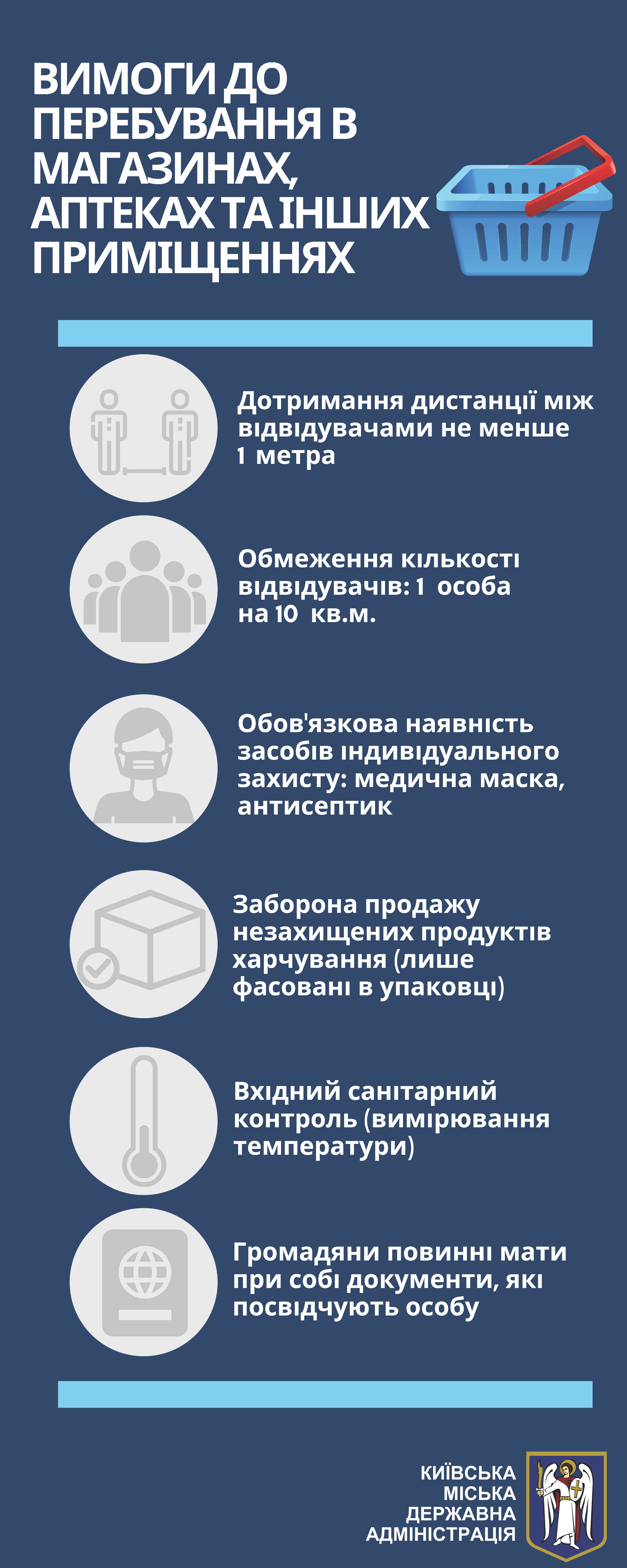 Для попередження поширення захворювання на гостру респіраторну хворобу COVID-19 розпорядженням № 2 керівника робіт з ліквідації надзвичайної ситуації затверджено низку вимог та обмежень до перебування у магазинах, аптеках та інших приміщеннях.