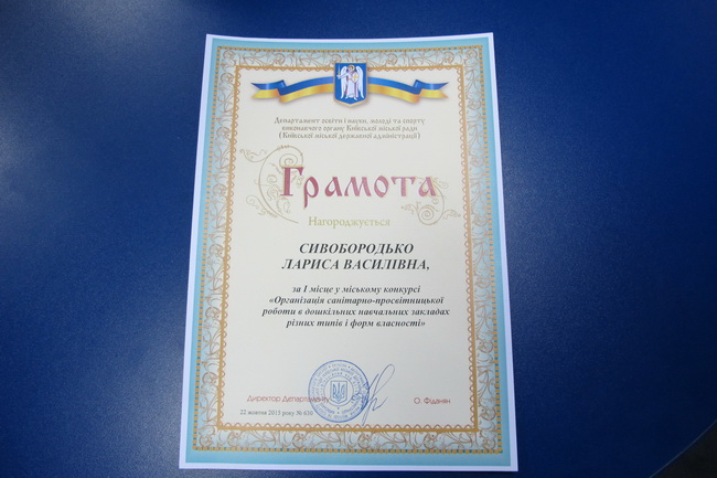 Ця наполеглива робота дозволила Ларисі Василівні здобути перемогу у міському конкурсі «Організація санітарно-просвітницької роботи в дошкільних навчальних закладах різних типів і форм власності» і отримати Грамоту Департаменту освіти і науки, молоді та спорту виконавчого органу Київської міської ради (Київської міської державної адміністрації).