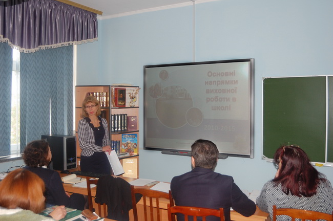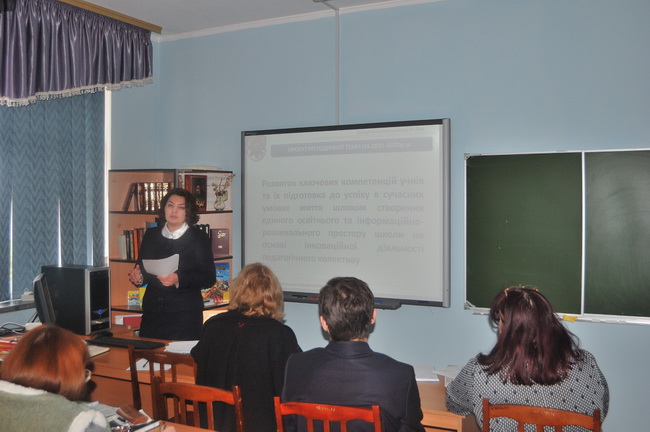 Заступник директора з навчально-виховної роботи О.В.Безверха у своїй доповіді на тему: «Шляхи формування якісної освіти дітей та їх саморозвитку в контексті компетентнісного підходу до навчально-виховного процесу» підвела підсумки роботи педагогічного колективу школи над методичною темою за 2010-2015 р.р. Методичні об’єднання стали важливою ланкою в системі підвищення професійного рівня учителів, що здійснюють науково-методичне забезпечення викладання відповідних предметів. За складеними планами та графіками проводяться відкриті уроки, заходи, тижні педмайстерності, презентації, виставки, семінари, конкурси. Всі учителі школи взяли участь у цих заходах, їх обговоренні, оформленні розробок, планів, папок з матеріалами, дисків із презентаціями. Слід зазначити, що вчителі МО досягли значних успіхів у оволодінні інформаційними технологіями. Робота мала два напрямки: інформаційна підтримка предмета та розробка уроків із застосуванням мультимедійного проектора із залученням учнів до роботи над проектами. На засіданнях кафедр проводились семінари-практикуми для учителів МО з даної теми.