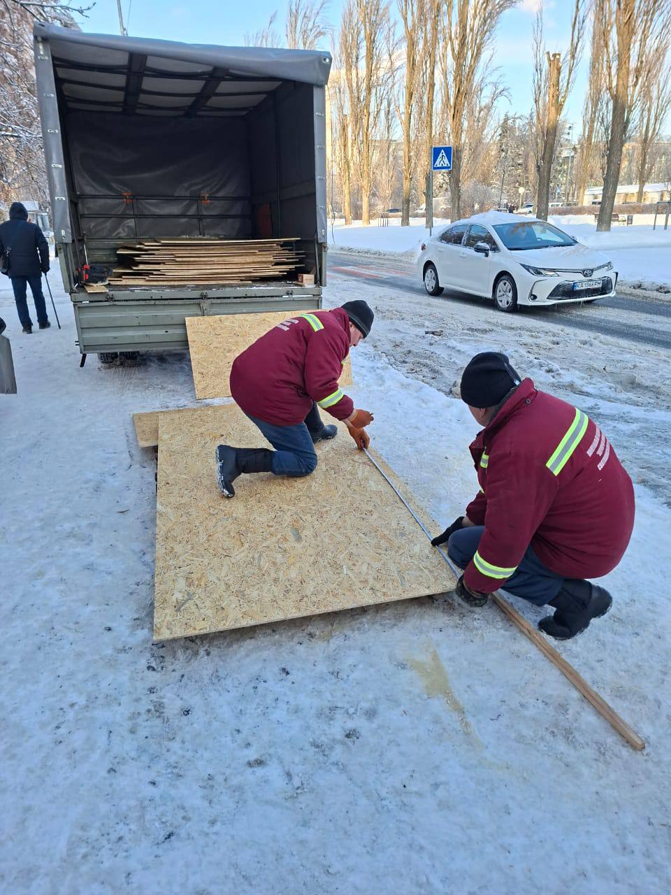 Працівники керуючої компанії з обслуговування житлового фонду Святошинського району продовжують роботи з ліквідації наслідків ворожої атаки. Станом на зараз уже закрито 85% вікон, які зазнали пошкоджень у житлових будинках району. Роботи тривають без перерви. До кінця дня всі вибиті вікна планується повністю закрити.