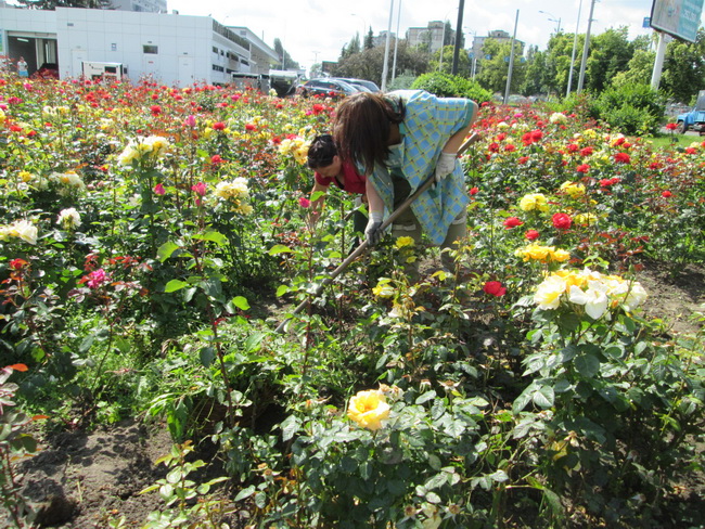 На транспортній розв’язці на вулиці Героїв Космосу зачаровує погляд квітування понад 3 тисяч різноманітних чарівних кущів троянд. І щоб королева квітів почувала себе комфортно, була стрункою та красивою, довго квітувала, дбайливі озеленювачі дільниці № 2 постійно піклуються про неї. Зокрема, для пишного квітування троянд на минулому тижні проведено планове підживлення мінеральними добривами, а наразі проводиться чергове прополювання розарію.