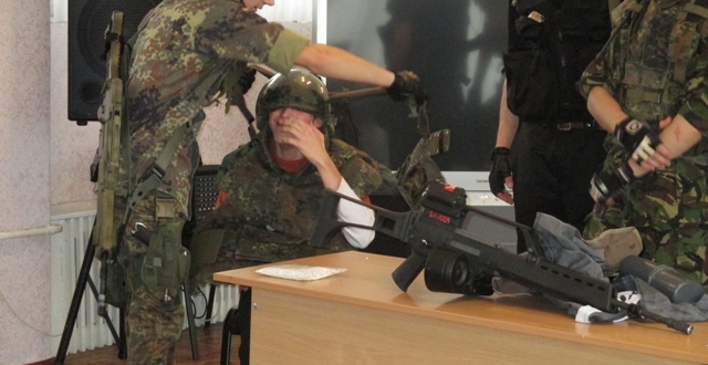 Цікаво було наочно побачити муляжі зброї, гранати, штик-ніж, флягу військового, броне-жилет, каску.