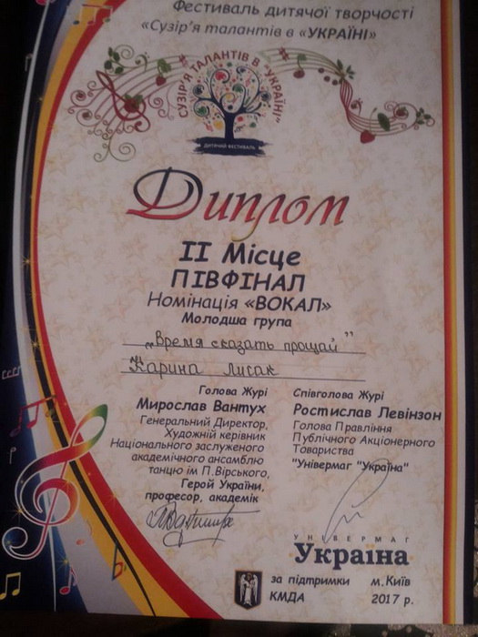 Київську дитячу музичну школу №23 відділу культури та охорони культурної спадщини представили учениці вокально-хорового відділу класу академічного співу, клас викладача Тетяни Стефанишиної. Карина Лисак посіла почесне II місце і вийшла в фінал фестивалю, а Крістіна Лоб стала дипломантом фестивалю.