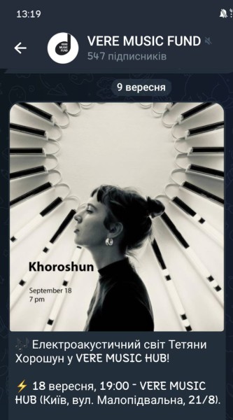 Викладачка теоретичного відділу Київської дитячої музичної школи № 22 Світлана Постовойтова, разом зі своїми учнями 4-го базового рівня відвідали концерт електроакустичної музики Тетяни Хорошун – справжній музичний калейдоскоп: звук, світло, емоції, які буквально перепліталися між собою. Мистецьке дійство проходило у затишному хабі VERE MUSIC FUND.