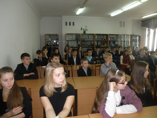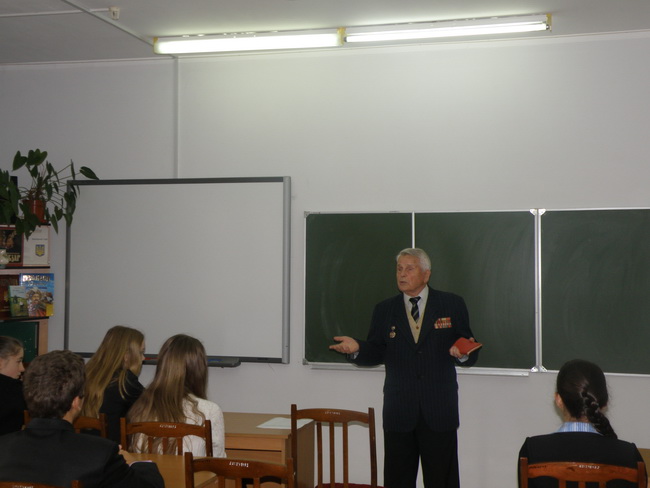 Учні 8 – 10 класів з хвилюванням слухали розповідь ветерана Великої Вітчизняної війни про страшні моменти війни, про фронтову юність, про знедолене дитинство в роки війни…Розповів ветеран школярам і про форсування Дніпра, і подвиг солдат та офіцерів.