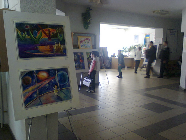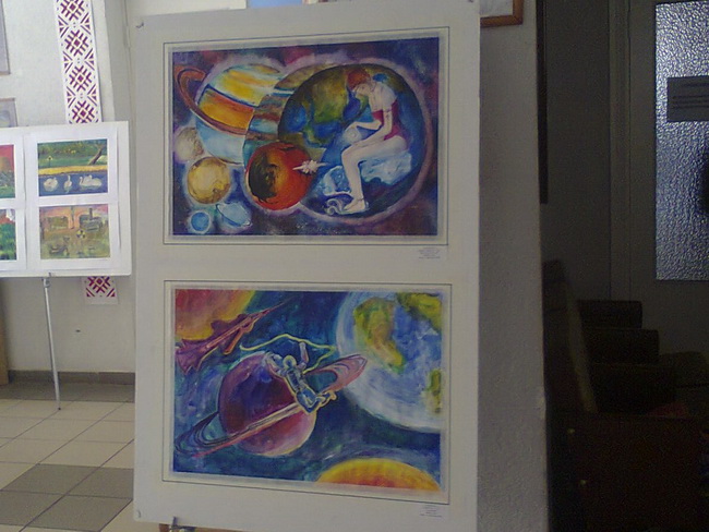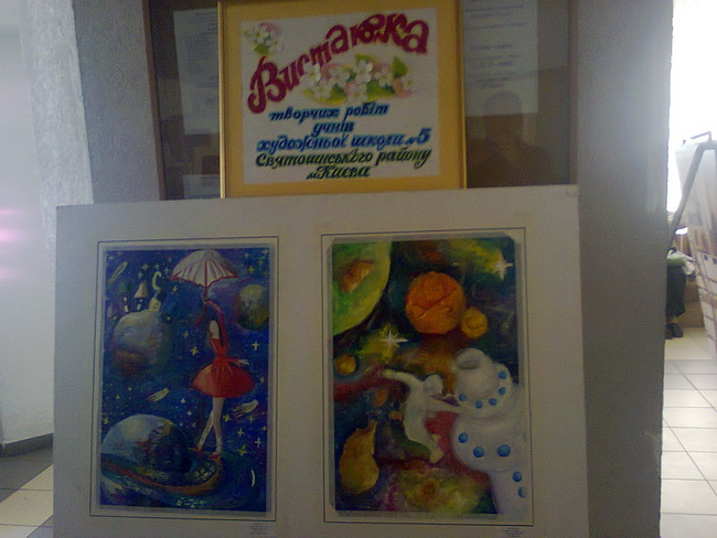 Основу експозиції сформували картини, які презентувала Київська дитяча художня школа № 5. Учнівські роботи з живопису за темами «До 29 роковини Чорнобильської трагедії», «У космосі...» та з декоративно-прикладного мистецтва за темою «Квіти весни» стали справжньої окрасою виставки. Свої роботи на виставку представили 25 учнів художньої школи (клас викладачів Прядка Михайла Васильовича, Ткачука Анатолія Карповича, Єременко Наталії Миколаївни, Скрипки Алли Миколаївни, Кисельова Олексія Олексійовича).