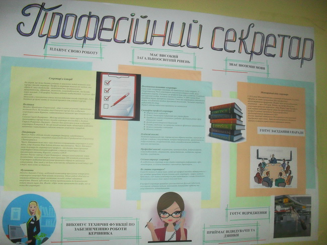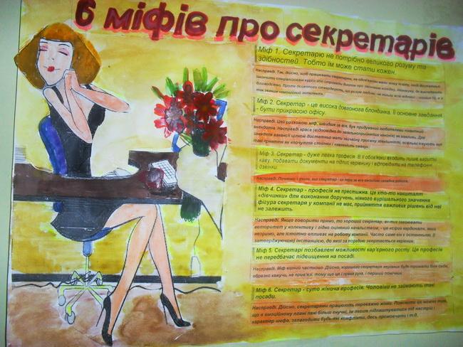 В стіннівках були висвітлені такі актуальні теми: "6 міфів про секретарів", "Професія секретар", "Секретарська справа", "Професійний секретар", "Ділове іноземне листування", "Робоче місце секретаря".