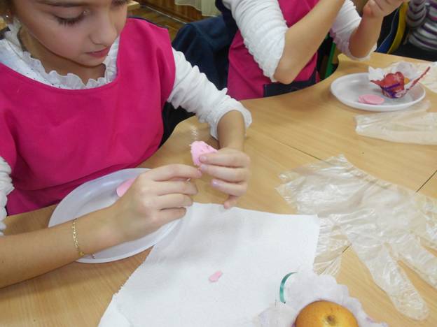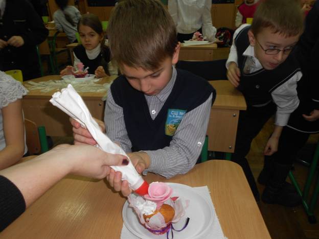 Діти з задоволенням виготовляли рожеві троянди зі спеціальної кондитерської мастики, якими прикрашали кекси з начинкою, різнокольоровим кремом малювали узори на тістечках.