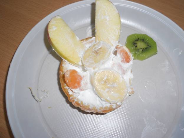 Хлопчики й дівчатка навчилися наповнювати корзиночки джемом та кремом, прикрасили їх фруктами (шматочками ківі, яблук, бананами, мандаринками). В результаті в дітлахів вийшли чудові святкові кошики з фруктами , тваринками та смайликами.