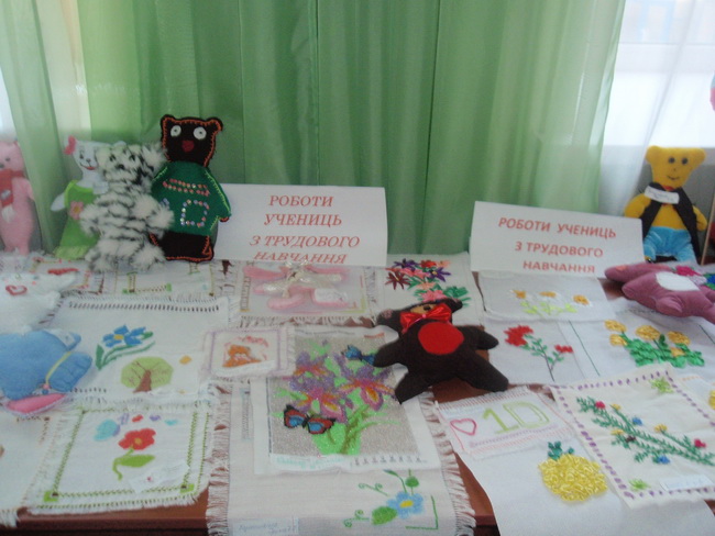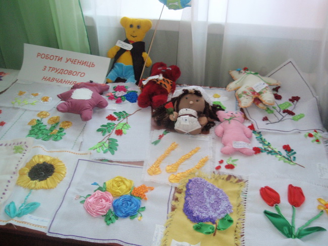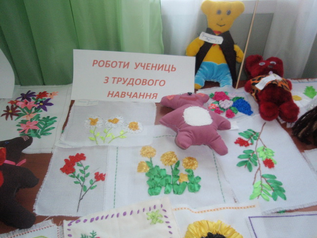 Рушники, серветки, доріжки, фартухи, портрети, натюрморти, квіти, вишиті стрічками, хрестиком, рішельє – усе це роботи учнів 5-9 класів на уроках трудового навчання.