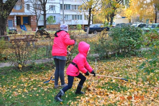 Приклали свої рученята до озеленення і діти, адже мешканці будинку вийшли на суботник цілими сім’ями. Працюючи нарівні з дорослими дітлахи очищували газони і прибудинкову територію від опалого листя, а дорослі завантажували його на трактор для подальшого вивезення.