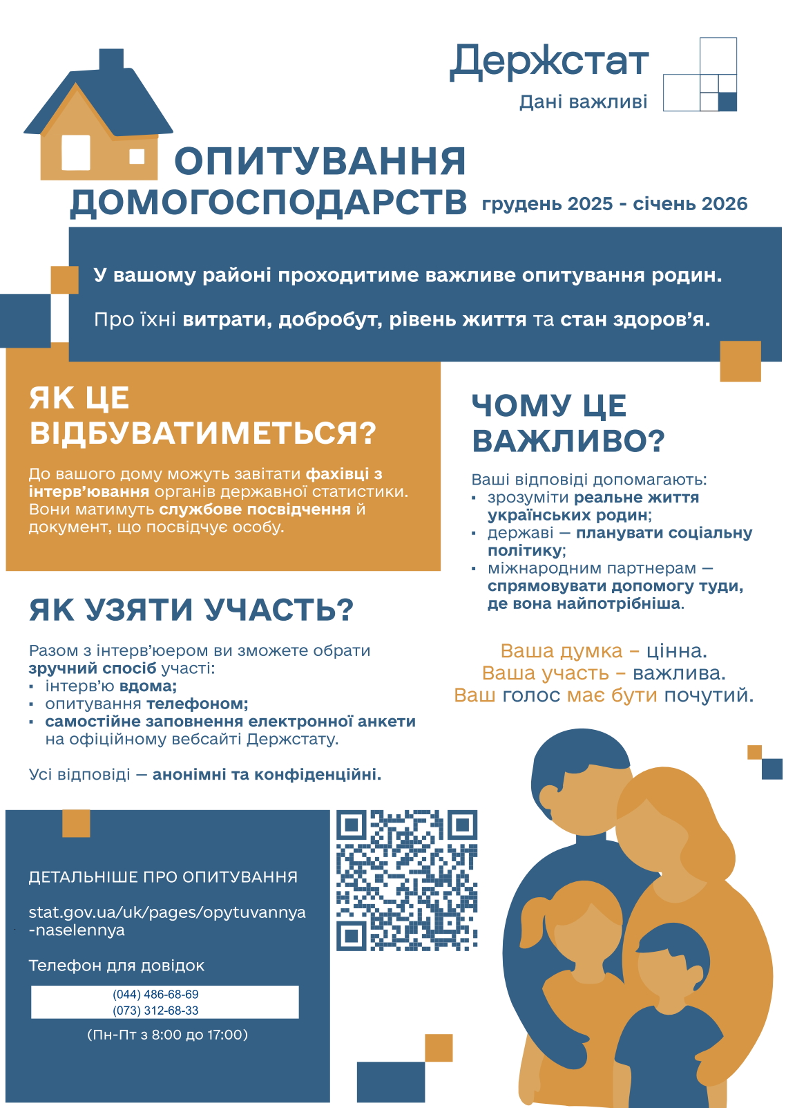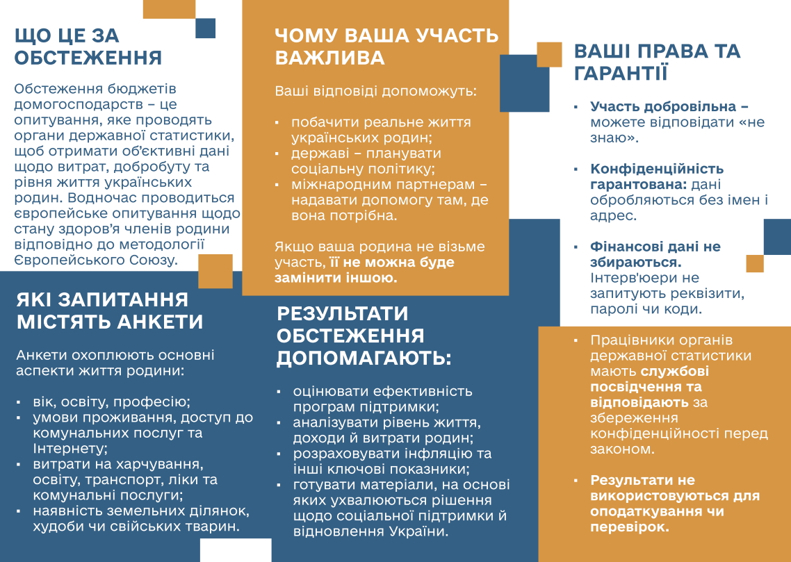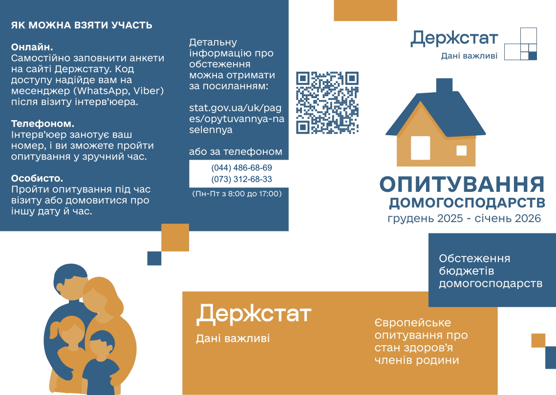 Участь в опитуванні є добровільною, а конфіденційність відповідей – гарантованою. Отримані дані знеособлюються та не містять персональних ідентифікаторів. Жодних банківських реквізитів, паролів або сум на рахунках не запитують. Результати не використовуються для перевірок чи оподаткування. Усі інтерв’юери діють відповідно до Закону України «Про офіційну статистику».