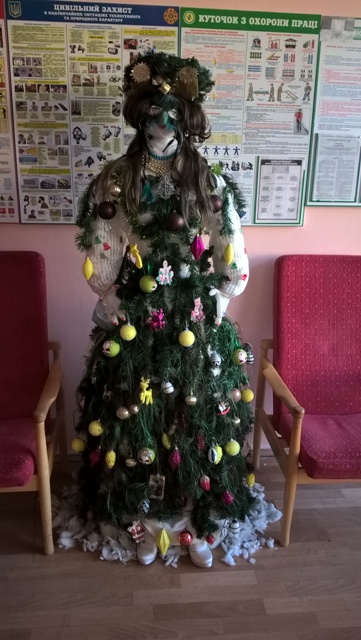 Сьогодні, 15 грудня, працівники житлово-експлуатаційної дільниці №2, крім своїх звичайних справ, займались дуже творчої роботою – прикрашали новорічну ялинку. Крім новорічної красуні, яка встановлена в приміщенні дільниці (Кільцева дорога, 5-Б), працівники прикрасили чудову та загадкову супутницю ялинки.