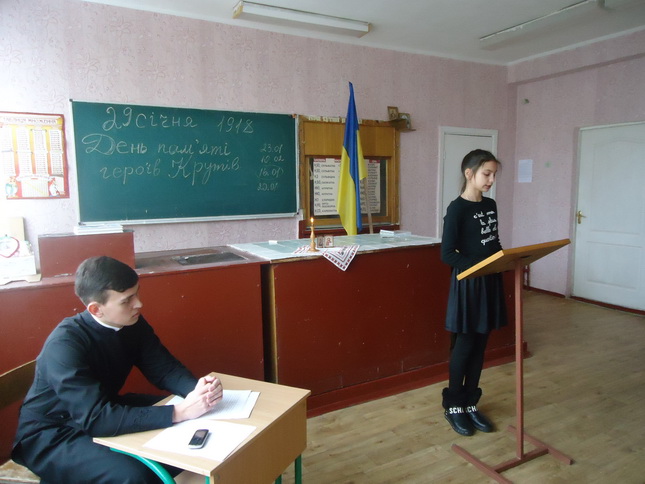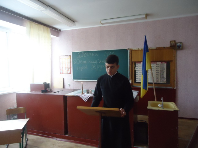 В ЗЗСО № 235 ім. В Чорновола ця тема була обговорена на кількох заходах. Перший – це відкрита лекція, проведена для старшокласників студентом Київської православної богословської академії Дмитром Боровим. Вступне слово до лекції зробила заступник директора Штефан А.І., яка провела паралелі між подіями сторічної давнини і сьогоденням. Потім Боровий Д., як майбутній священик, прочитав молитву за вічний спокій полеглих за волю України і розповів учням про історичні факти бою під Крутами. Виступ юнака був емоційним і переконливим. Хлопець говорить про подвиг молодих студентів київських ВУЗів 1918 року так, ніби він пережив ті події особисто. Під кінець виступу Дмитра на його очах і очах слухачів блищали сльози.