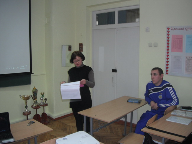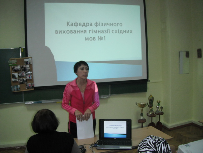 Голова методичного об’єднання вчителів фізичної культури, учитель-методист, відмінник освіти України Худжамова Т.П виступила з представленням діяльності гімназії перед учасниками семінару, а з презентацією саме спортивно-масової роботи гімназії - учитель-методист Кобилянська Л. М.