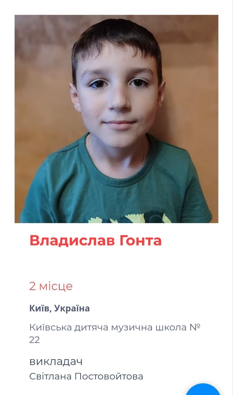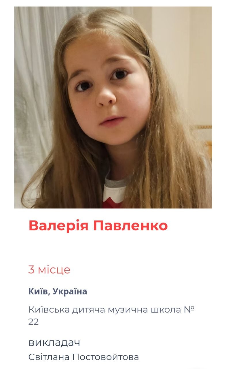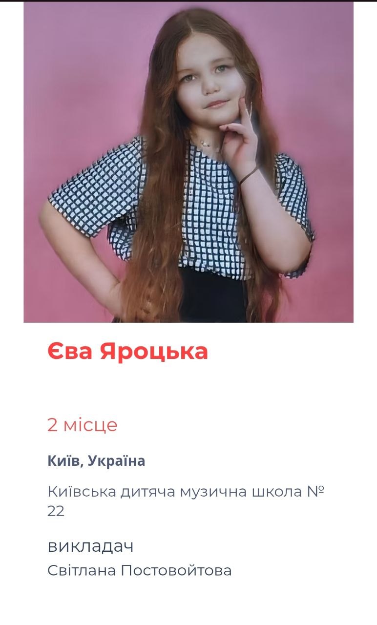 Учениця Київської дитячої школи мистецтв № 8 Яковлєва Єлизавета блискуче продемонструвала свої творчі надбання та за результатами напруженої роботи в обох турах Єлизавета здобула І місце, набравши 47,5 бала з 48 можливих — вражаючий результат, що свідчить про високий рівень підготовки.