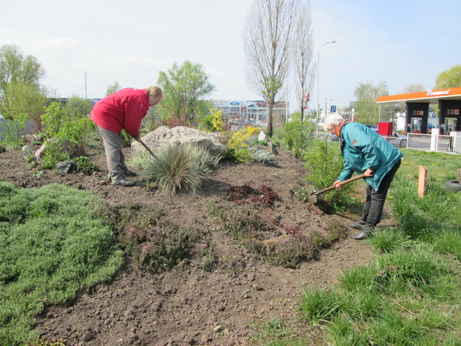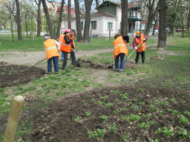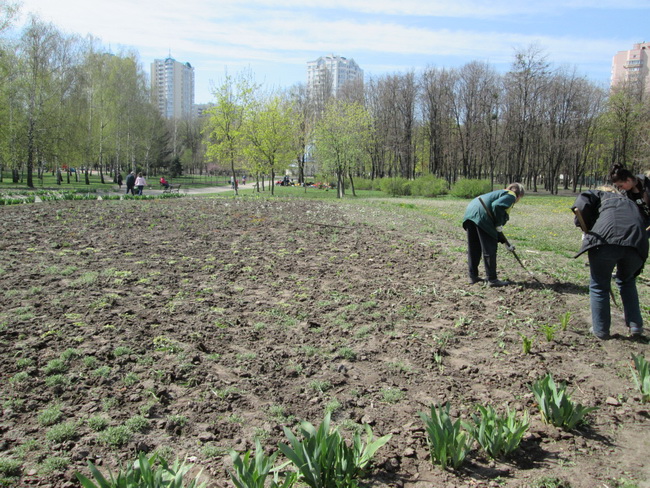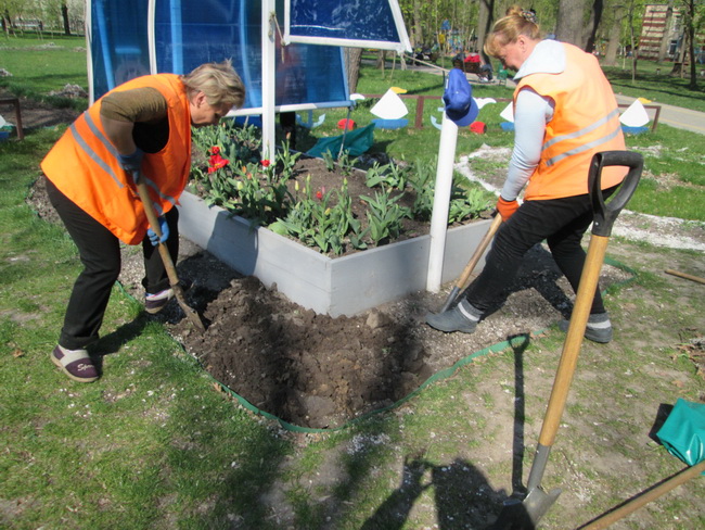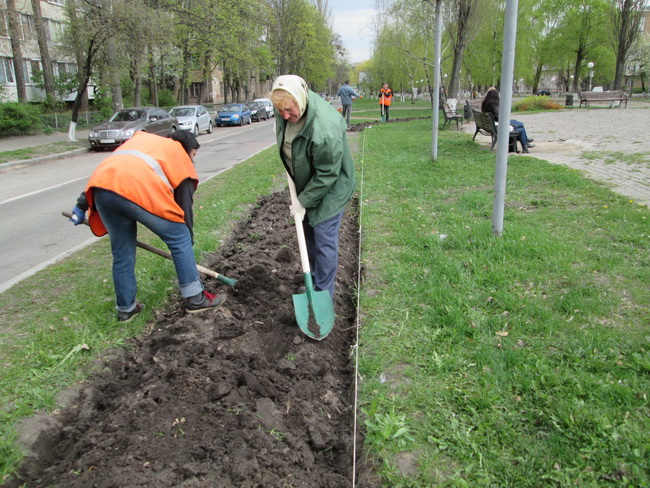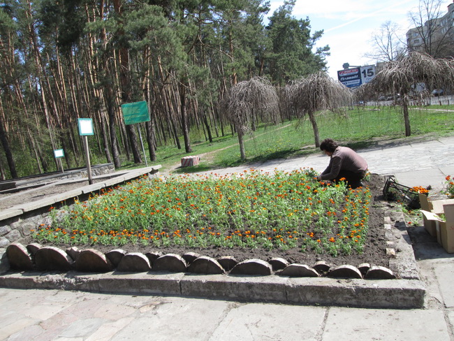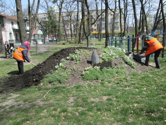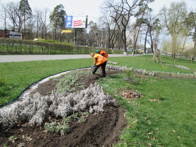 Щоб квітники з ранньої весни до пізньої осені постійно милували очі мешканців та гостей Святошинського району, невтомні працівники зеленого господарства в ці весняні дні сумлінно та професійно проводять доглядові роботи: прополюють та розпушують грунт навколо рослинок, поливають та підживлюють мінеральними добривами для пишного їх квітування, перекопують та висаджують на клумби уже підготовлену на тепличній дільниці підприємства квітучу розсаду.