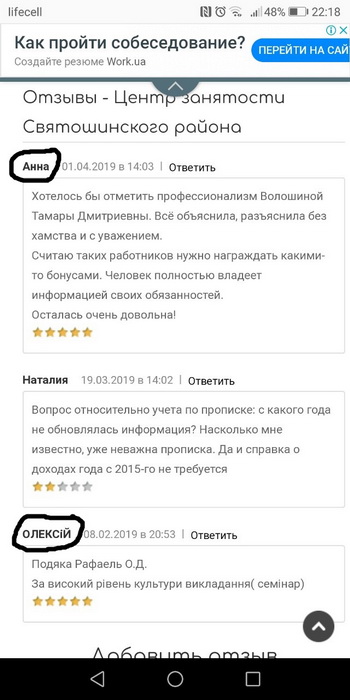 Так, фахівці Святошинської районної філії Київського міського центру зайнятості, з точки зору відносин з громадянами центру зайнятості демонструють доступність, лояльність, надають психологічну та моральну допомогу, уникають бюрократичних методів роботи, показуючи натомість демократичний стиль діяльності державної служби. Прикладом цього є відгуки громадян на сайті «Відгуки – Центр зайнятості Святошинського району». Знайомтеся, це фахівці: Волошина Тамара Дмитрівна – провідний фахівець з питань зайнятості відділу надання соціальних послуг та Рафаелян Олена Дмитрівна – провідний фахівець відділу профорієнтації.