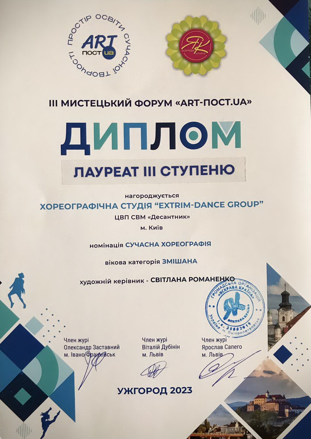 Пишаємося тим, що серед такої великої конкуренції колективів з Київської, Дніпропетровської, Житомирської, Львівської, Рівненської, Хмельницької, Одеської, Кіровоградської, Запорізької, Полтавської та Закарпатської областей вихованки гуртка спортивної сучасної хореографії святошинського центру «ДЕСАНТНИК» у складі хореографічної групи «EXTRIM-Dance Group» під керівництвом Романенко Світлани вибороли диплом лауреата 3-го ступеня.