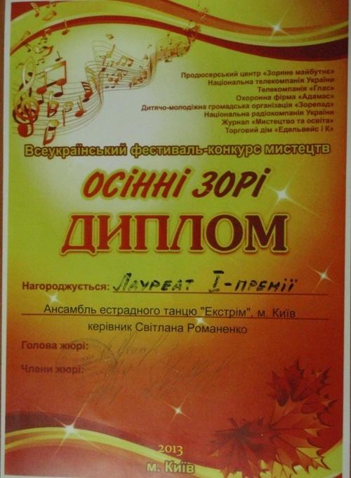 Вітаємо ансамбль сучасного танцю «Екстрім» (керівник — Світлана Романенко) підліткового клубу за місцем проживання по роботі з дітьми, підлітками та дорослим населенням «Фотон» (бул. Ромена Роллана, 13 - в) Централізованої системи підліткових клубів «Щасливе дитинство» управління у справах сім'ї, молоді та спорту Святошинської районної в м. Києві державної адміністрації з потужним та видовищним виступом на Всеукраїнському фестивалі-конкурсі «Осінні зорі - 2013» та отриманням І премії!