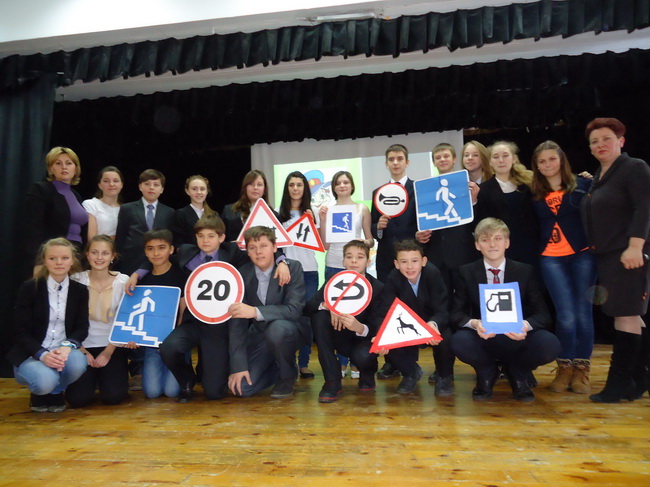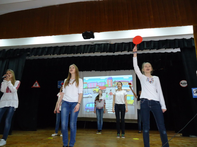 Ведучі заходу – учні 8-Б класу Бойченко Світлана та Сторожишин Юля провели з присутніми цікаву та важливу вікторину: чи знають глядачі дорожні знаки та дорожню розмітку, чи вміють вони переходити дорогу та обходити транспортні засоби. Відповіді глядачів підтверджувались відповідними слайдами.