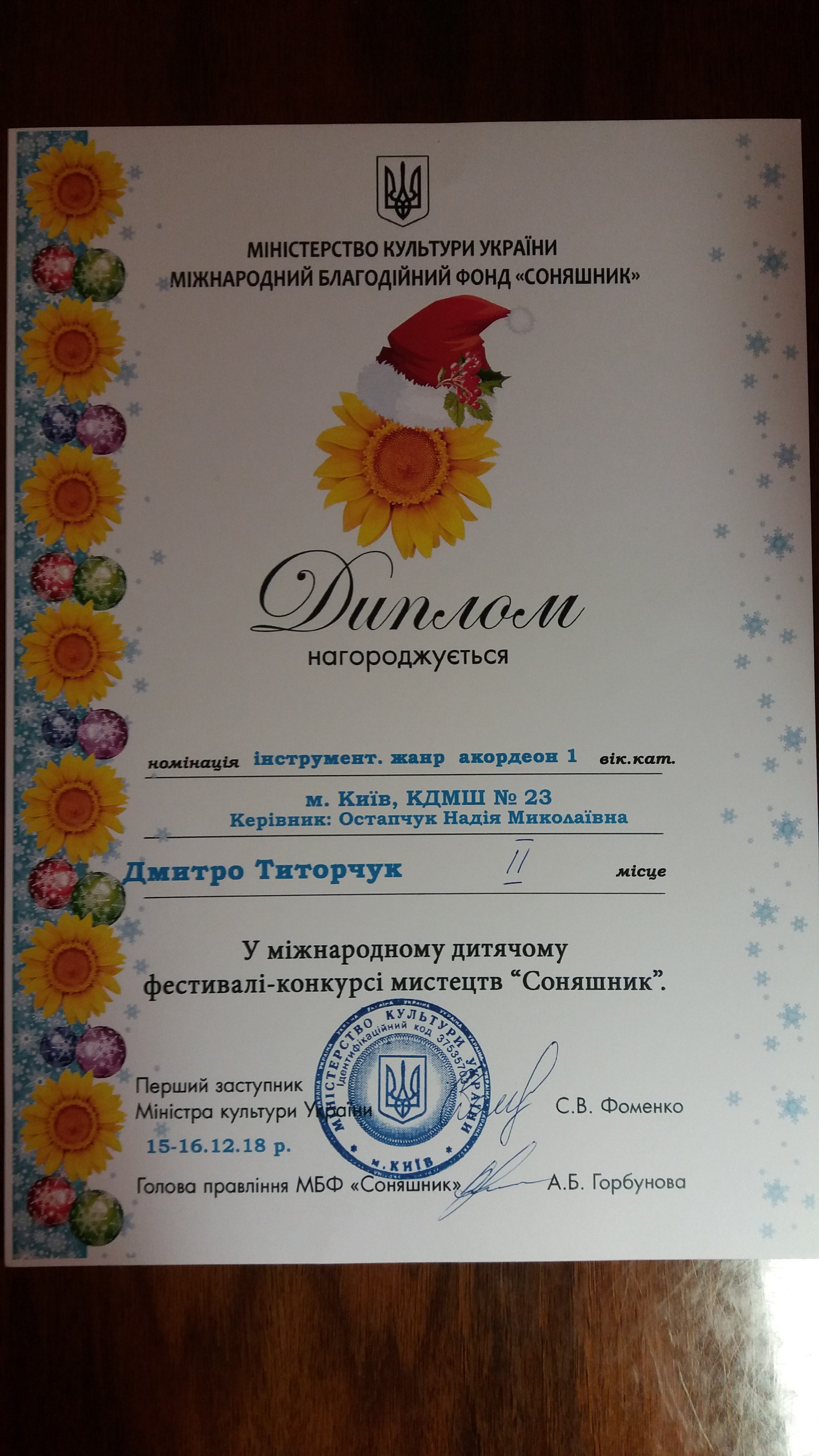 Цими днями у Києві відбувся Міжнародний фестиваль-конкурс мистецтв «Соняшник». У творчому змаганні виступили та отримали нагороди юні музиканти – вихованці Київської дитячої школи мистецтв № 8 та Київської дитячої музичної школи № 23 відділу культури та охорони культурної спадщини.