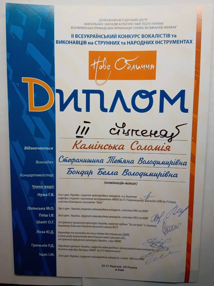 Учениця 1 класу вокально-хорового відділу класу академічного співу Київської дитячої музичної школи № 23 відділу культури та охорони культурної спадщини Соломія Камінська (викладач Стефанишина Тетяна Володимирівна, концертмейстер Бондар Белла Володимирівна) взяла участь у ІІ Всеукраїнському конкурсі вокалістів «Нове обличчя», який проходив нещодавно в Будинку-музеї Миколи Лисенка (вул. Саксаганського, 95) і отримала ІІІ премію на ньому.