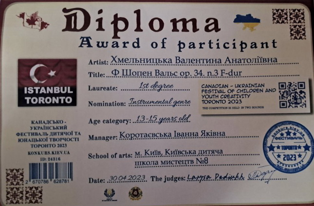 На Канадсько-українському фестивалі дитячої та юнацької творчості «Торонто 2023» за яскраве виконання «Вальсу» Ф. Шопена високоповажне журі відзначило дипломом І ступеня Валентину Хмельницьку, клас викладача Іванни Коротаєвської.