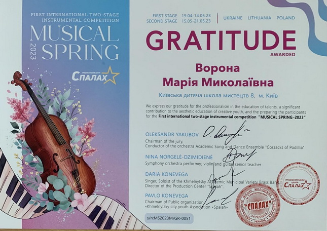 Юна піаністка Худіна Ярослава, клас викладач Марії Ворони, здобула перемогу на І Міжнародному двотуровому інструментальному конкурсі «MUSICFL SPRING 2023» та стала лауреатом ІІ премії.