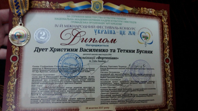 У яскравому мистецькому змаганні взяли участь та отримали гідну перемогу учні Київської дитячої школи мистецтв № 8 відділу культури та охорони культурної спадщини, посівши почесне ІІ місце: фортепіанний дует Василенко Христина, Бусняк Тетяна (викладач Світлана Бокій) та Пархомчук Софія (викладач Ольга Бурда).
