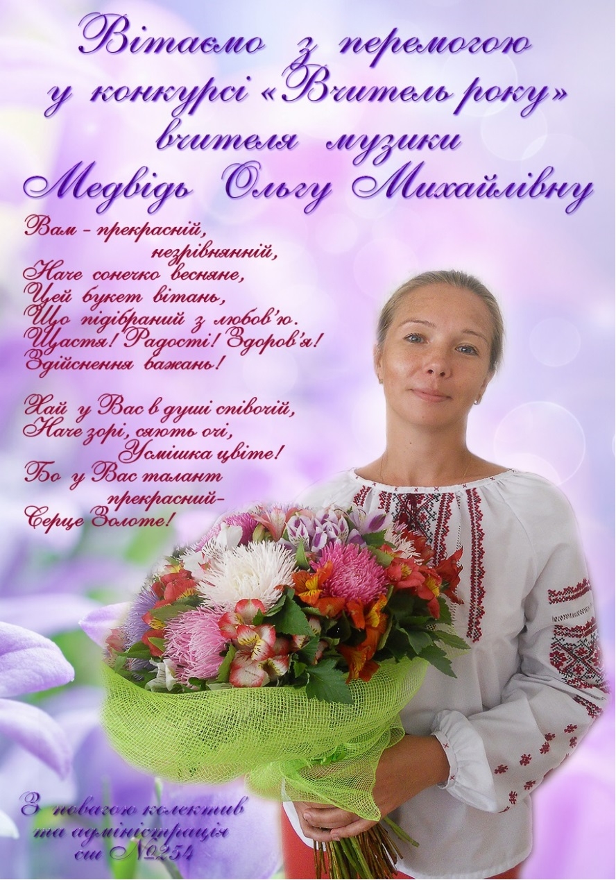 Вітаємо вчителя спеціалізованої школи № 254 Ольгу Медвідь з перемогою у ІІ (міському) турі Всеукраїнського конкурсу «Учитель року – 2017» у номінації «Музичне мистецтво».