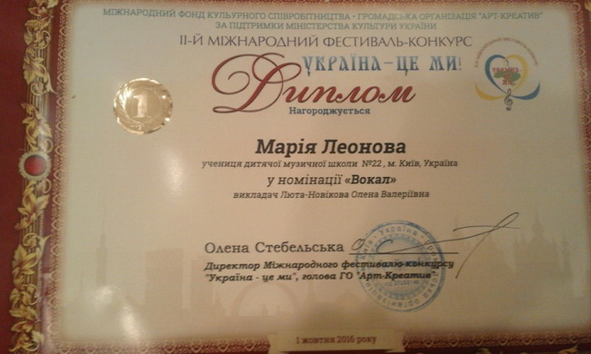 Вітаємо з високою нагородою ученицю Київської дитячої музичної школи № 22, юну співачку Марію Леонову (фото)